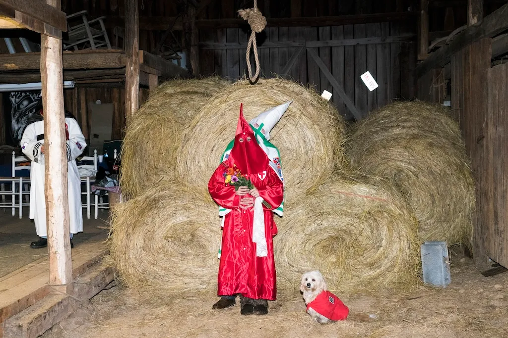 “This use was unauthorized,” van Agtmael stated bluntly, adding that a legal process is now underway to address the apparent copyright infringement. The photo is a deeply unsettling tableau of American extremism—set at a barn wedding where the newlyweds, descendants of Klan members, celebrated amid Confederate flags, disturbing decorations, and overt white supremacist symbolism. The couple reportedly dined on soggy fast-food roast beef sandwiches and posed with their dog Leroy, who wore a custom KKK robe bearing a “White Power” patch.